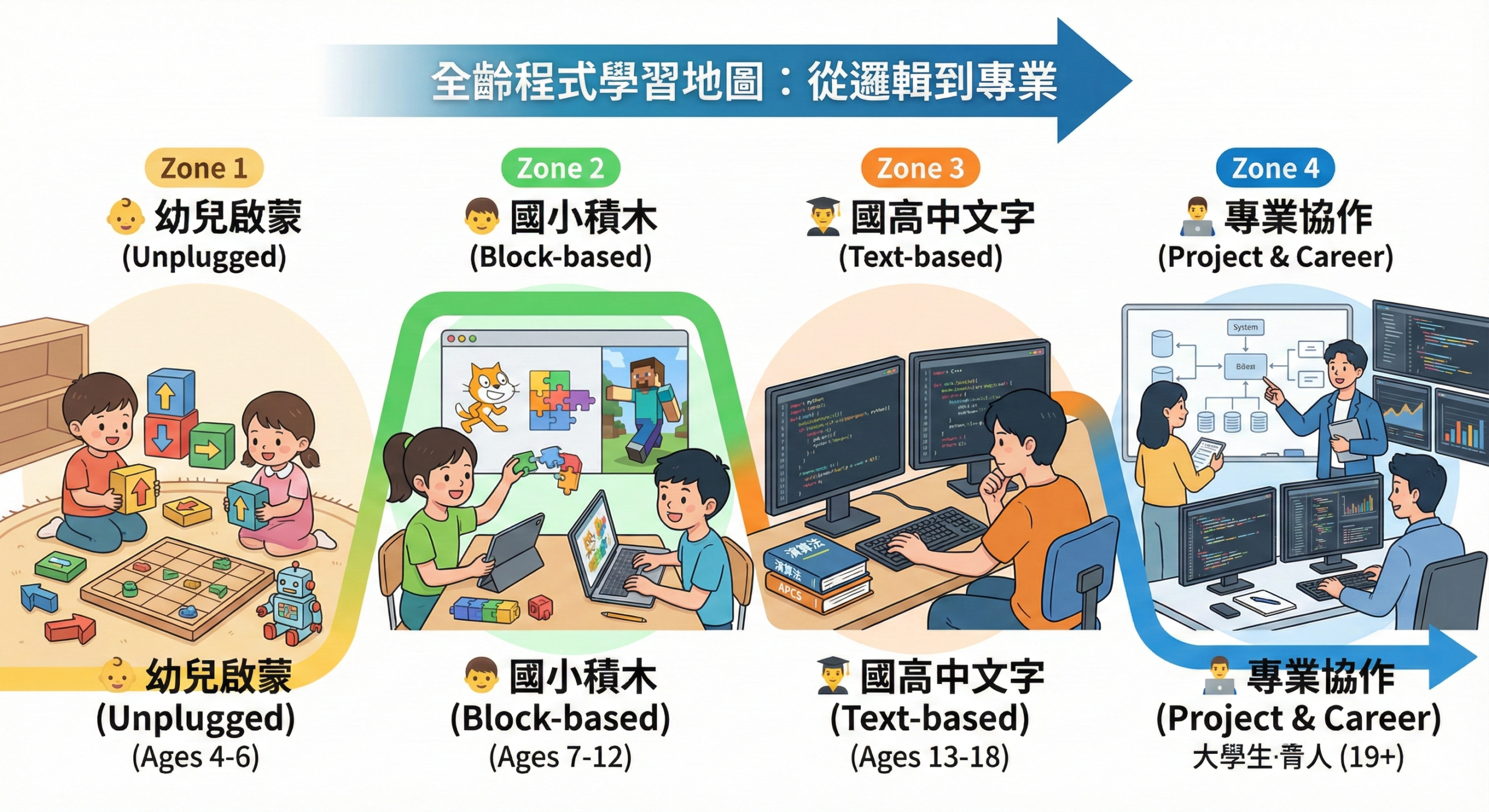 在 AI 快速發展的年代,家長最常問的問題就是:「孩子幾歲該開始學程式?」其實,學習程式語言並不是越早越好,但「運算思維(Computational Thinking)」的培養卻可以從生活做起。這份學習地圖將協助您釐清台灣教育體制下,從幼兒園到大學的最佳學習路徑。